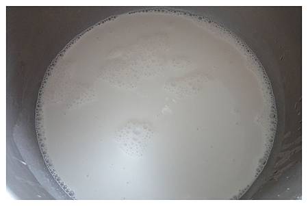 右上圖: 加入鍋中剩下的水煮到滾 (一定要全滾, 中間也冒泡泡), 熄火 (不熄火推漿易燒焦)
