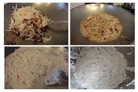 左上圖: 加入蘿蔔絲炒軟後加鹽及胡椒, 油葱酥 (香氣關鍵, 一定要加)